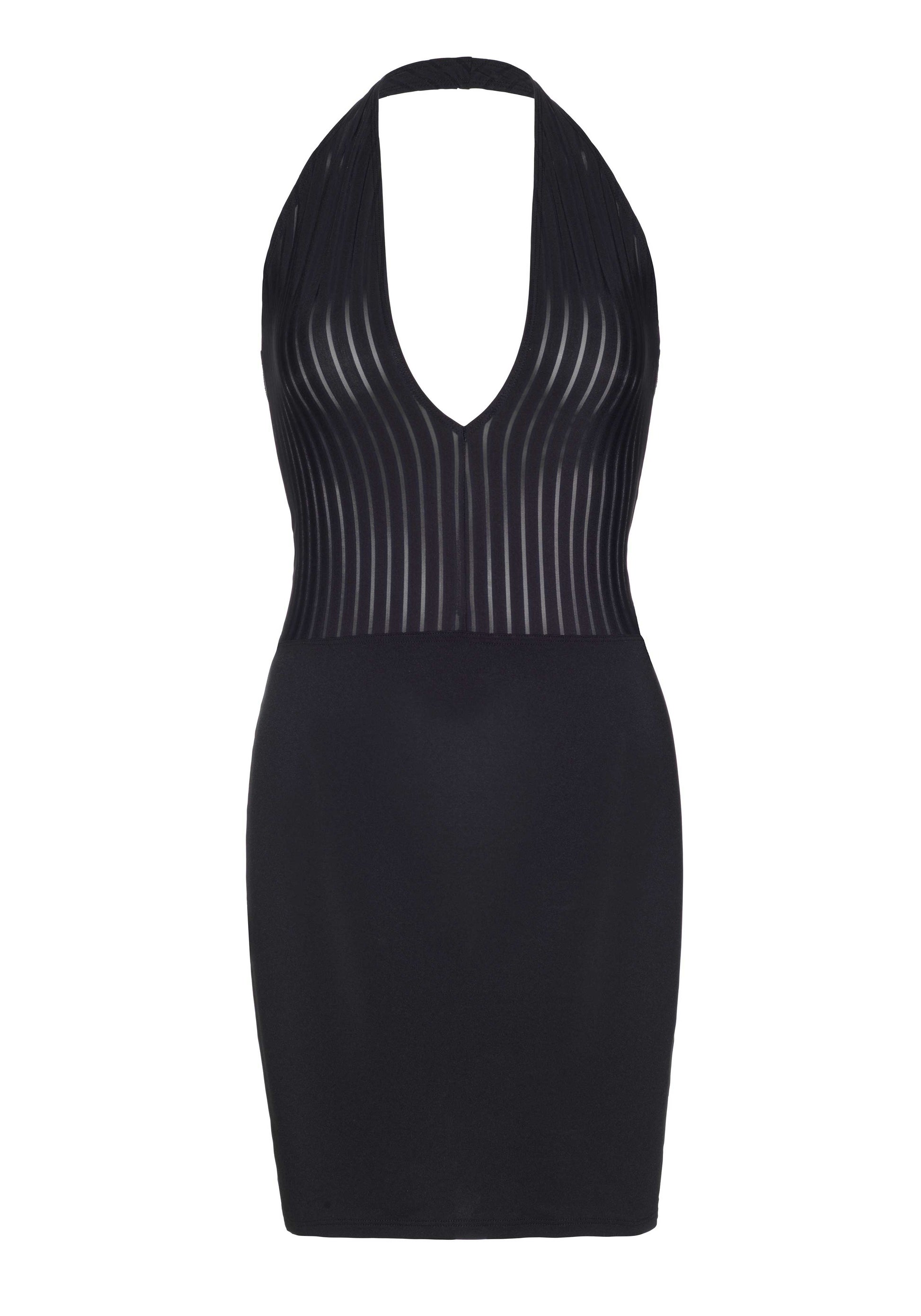 Es tiempo de fiesta, y todas las miradas puestas en ti con este vestido negro de canalé. Este vestido presenta un profundo escote en V y un escote halter. Es el vestido perfecto para un romance de medianoche en el dormitorio o durante una noche de fiesta.