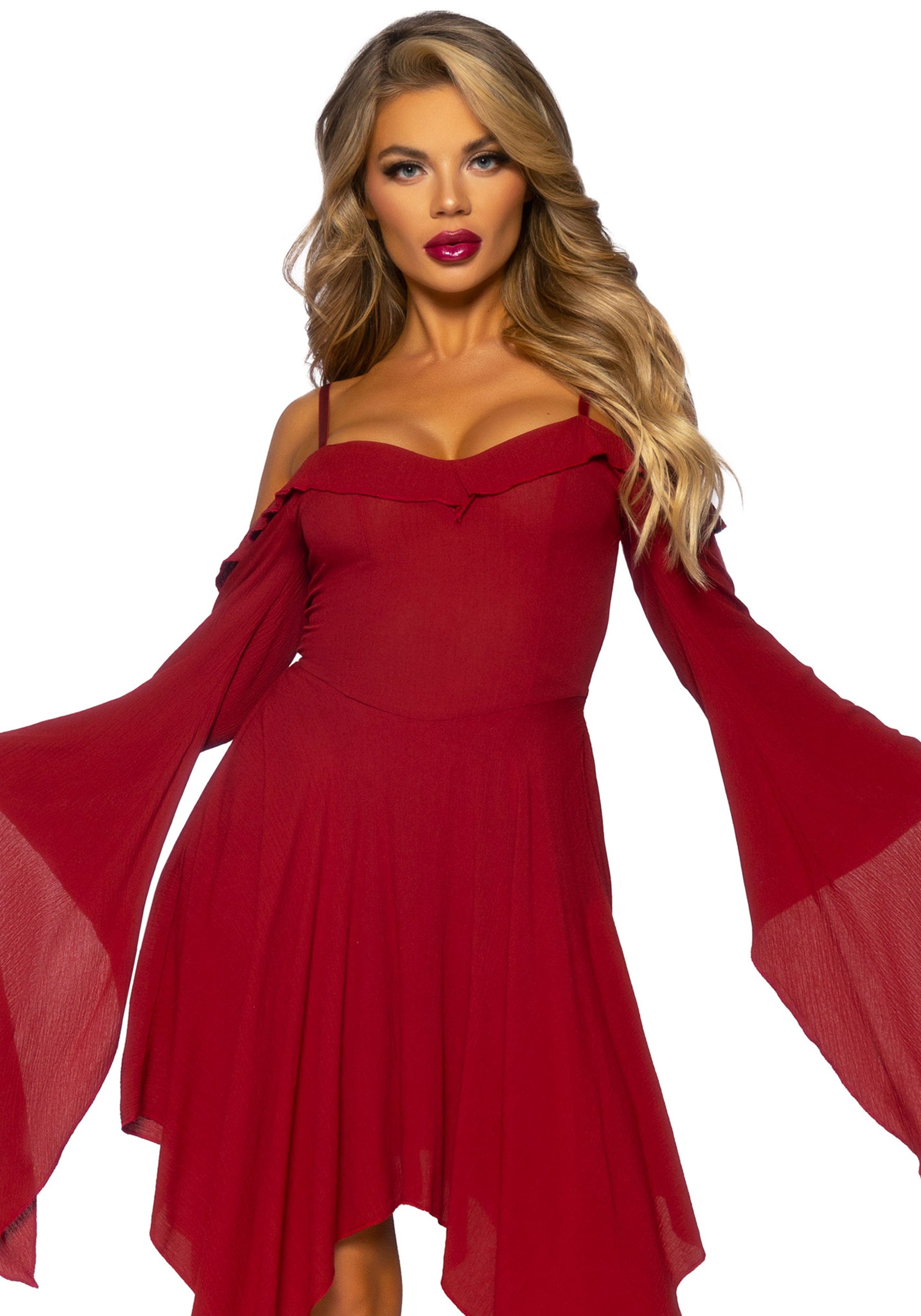 Mysterieus, boho of artistiek, met deze jurk met gaas klokmouwen creëer je eenvoudig verschillende looks. De jurk is gemaakt van flatterend katoen en heeft een sweetheart halslijn, koude schouders en een sjaalrok.