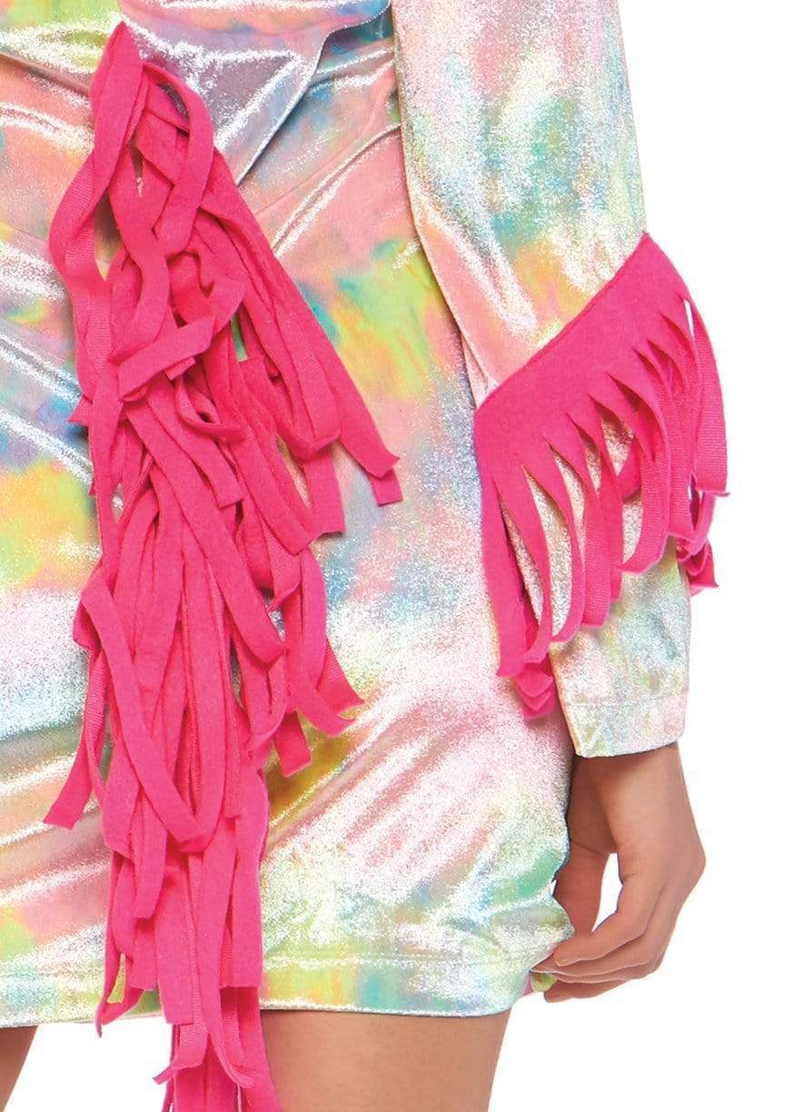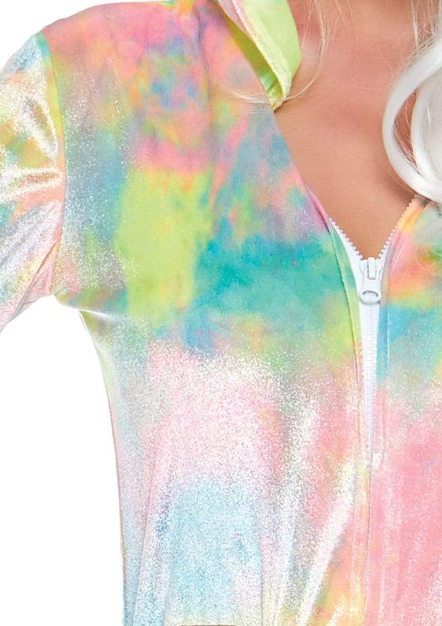Answer the magic call from the Unicorn's in this Enchanted Unicorn costume dress. The costume features velvet zipper front tie dye dress with pink tail and magical gold horn hood.