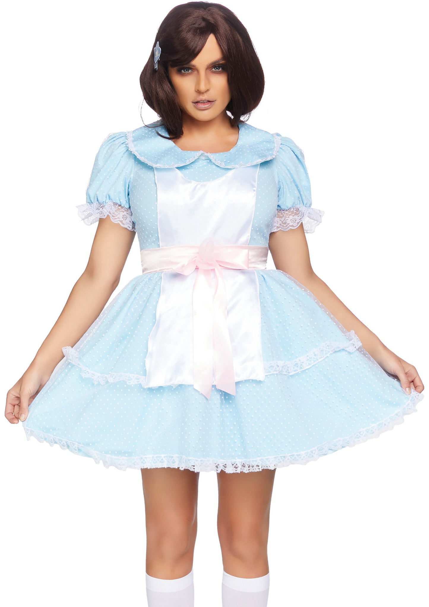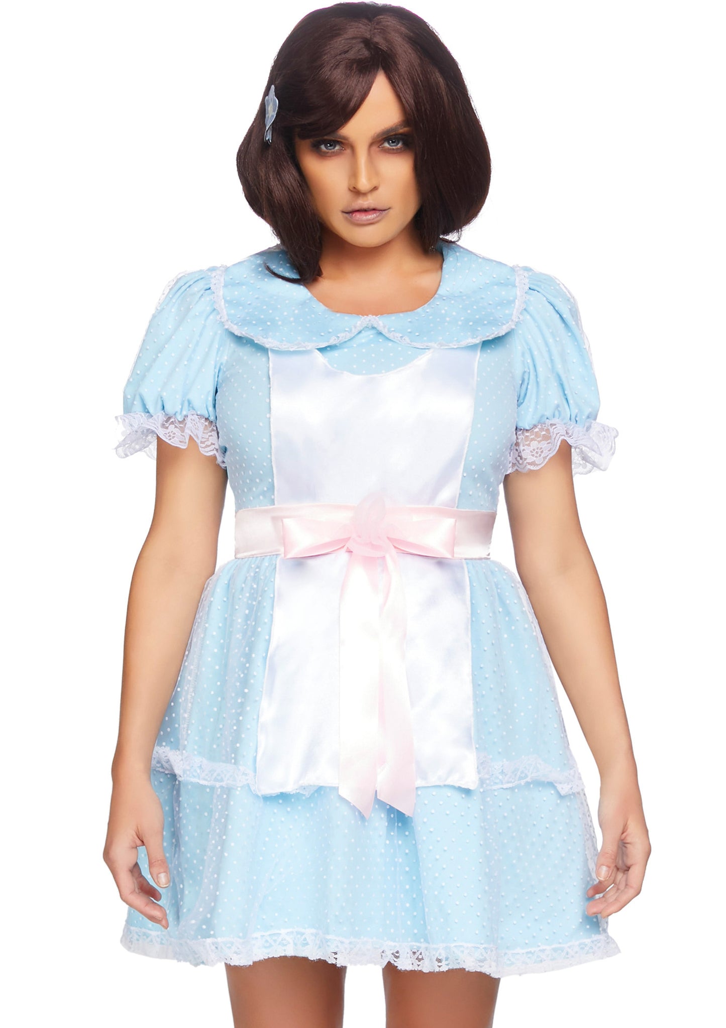 A double nightmare starts with twins and when it coincides with Halloween you better hurry up and get out of here!! This iconic 2 Piece Creepy Twins Costume, includes a classic babydoll apron dress with a mesh dot overlay, puffed sleeves, and darling satin sash with bow detail.