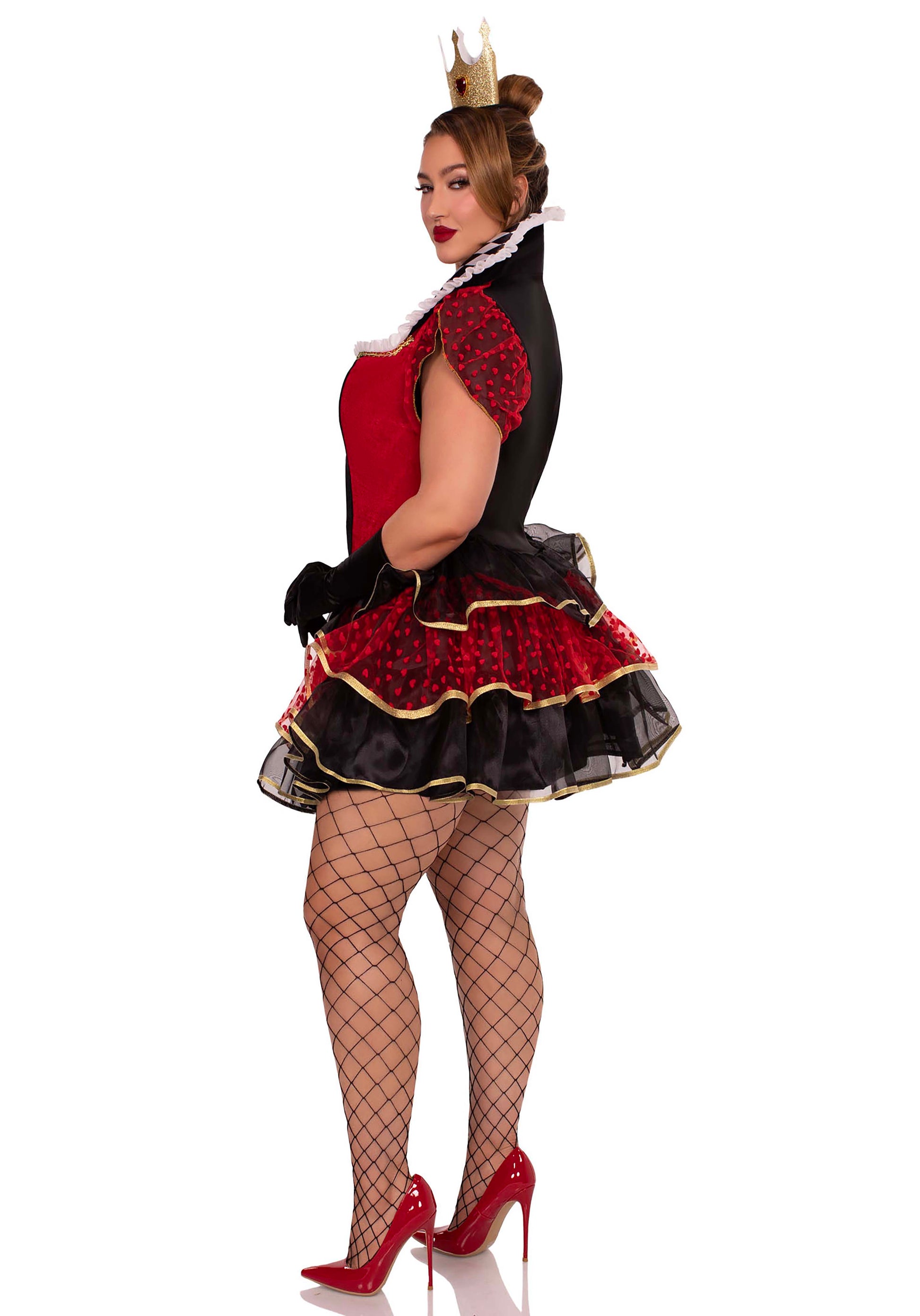 Get ready to turn heads with the 2-piece Plus Queen of Hearts costume from Leg Avenue. Inspired by Alice in Wonderland, this enchanting set features a layered dress with a striking high collar, a built-in petticoat, and a dazzling crown. Let your inner queen shine and rule Wonderland with confidence in this glamorous ensemble!