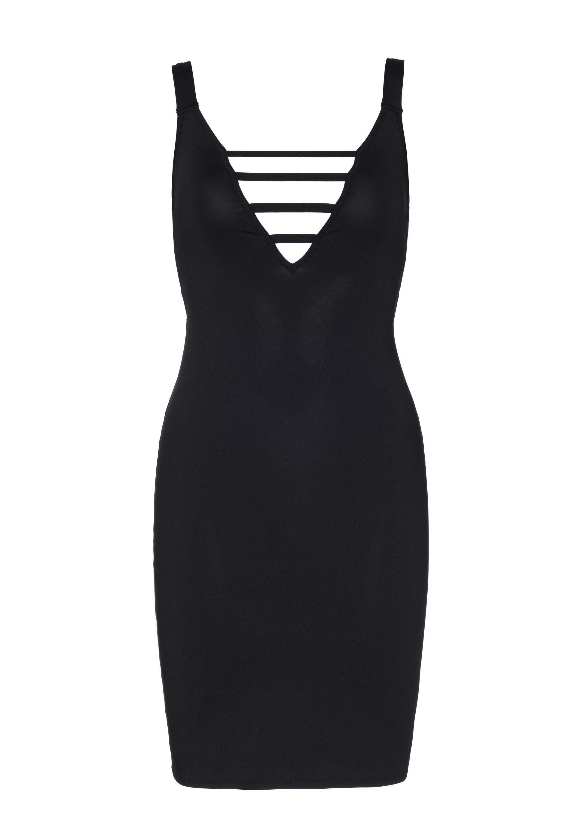 Deep-V mini dress with plunging strappy back.